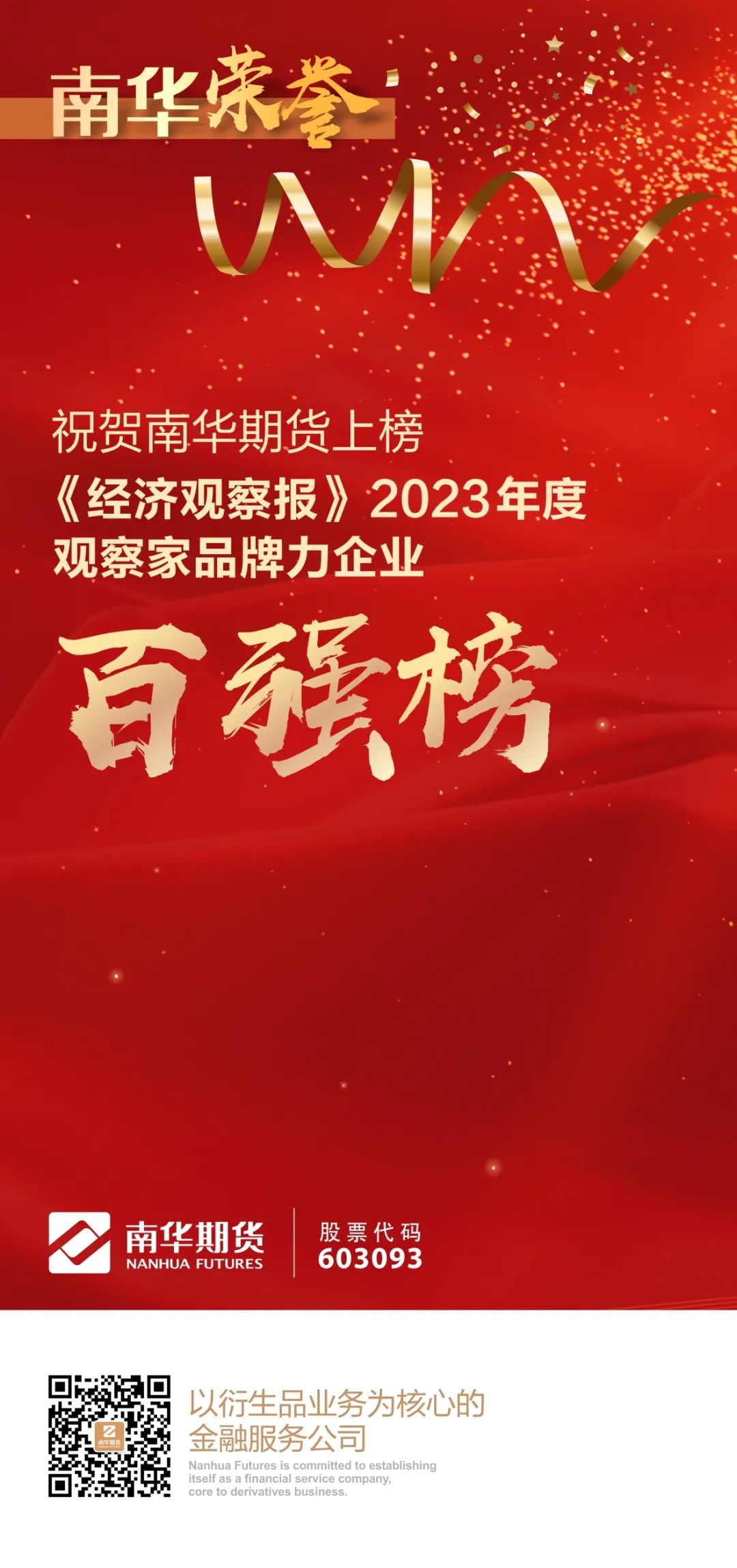 12月25日,由《经济观察报》发布的观察家品牌力2023年企业百强榜发布。南华期货荣誉上榜,这是南华期货连续五年上榜。