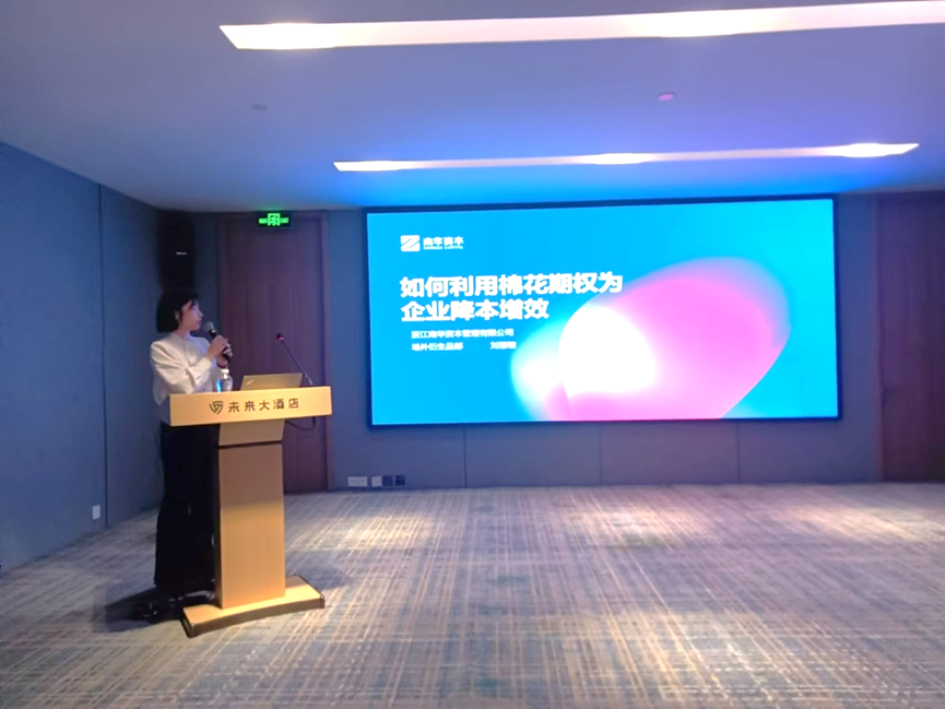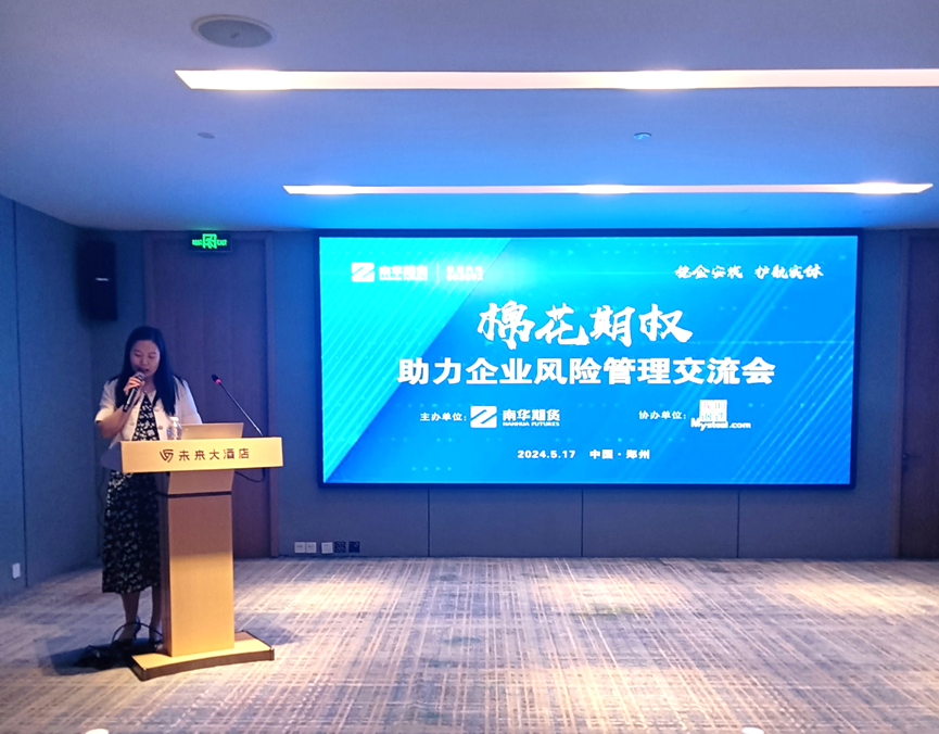 护航实体”棉花期权助力企业风险管理交流会在郑州未来大厦召开。本次交流会邀请宁波杉杉能化有限公司、河南同舟棉业有限公司等多家棉花上下游贸易商,旨在推广和应用棉花期权衍生品工具,帮助中小企业规避风险、稳定经营,促进棉花行业的发展和创新。活动由南华期货郑州营业部负责人刘红丽主持。