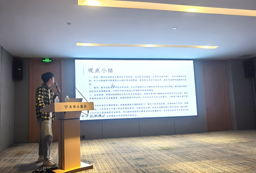 宁波杉杉能化有限公司棉花研究员余三川梳理了目前国内棉花市场供需形势,他主要通过解读USDA全球棉花供需5月平衡表24/25年度预估,了解国际市场对未来棉花供需的展望,确定外棉相对的估值区间,并通过分析天气和供应关系、全球主要棉纺出口国和消费国的数据对未来平衡表调整方向做一些猜想,最后对国内棉价进行展望。