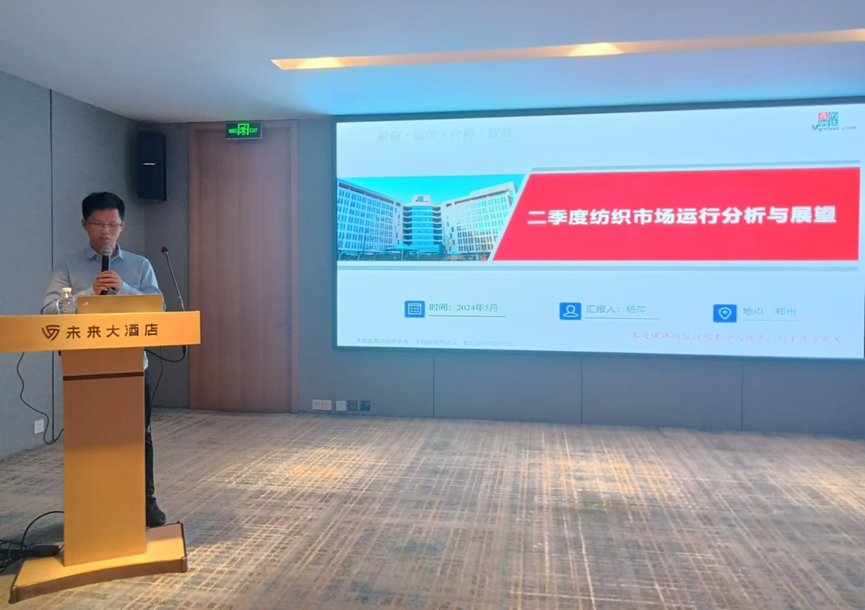 上海钢联棉花分析师杨萍以“二季度纺织市场运行分析与展望”为主题,回顾棉花与短纤、棉纱与替代产品历史价格与2024年市场运行情况,详细讲解了国内纺纱格局、纺企库存情况,他用较为详实的数据讲述纺织服装内销情况和棉纱、棉布、纺织品、服装出口情况以及纺织市场当下的现状与机遇。