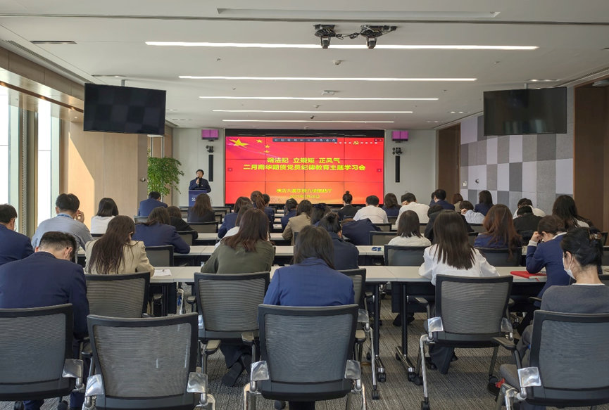 2月28日,南华期货党委在横店大厦东楼九楼鲲鹏厅召开“明法纪、立规矩、正风气”党员纪律教育暨二月主题党日学习会。会议由党群办主任张正明主持,公司总部党员现场参会,驻外党员线上同步参会。