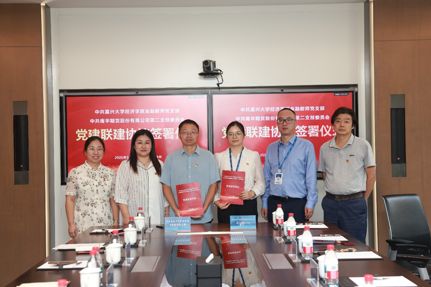 仪式在南华期货党委委员、副总经理钟益强和嘉兴大学经济学院党委书记、副院长蔡运男等见证下,由南华期货第二党支部书记袁丹和嘉兴大学金融教师党支部书记孙庆刚代表双方签署党建共建协议书。双方还围绕创新党建模式、整合校企优势资源等方面展开深入交流,共同探索基层党组织功能提升与事业发展的深度融合。