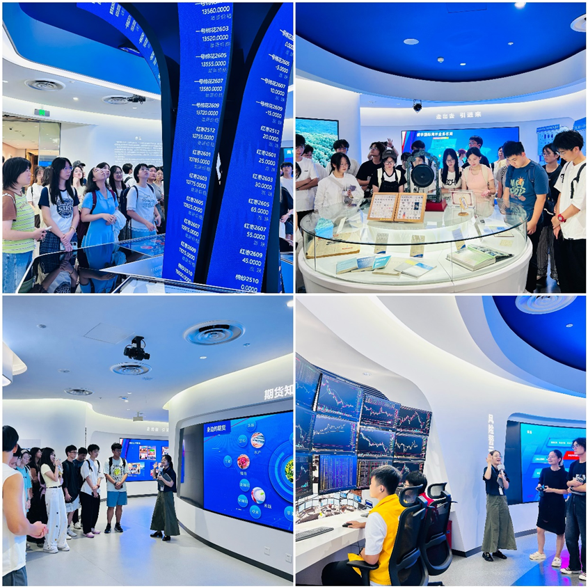 在专业讲解员的引导下,师生们参观了南华期货投教基地。基地内的“智慧财富树”功能区,借助实时数据可视化技术,使师生得以直观感知全球期货市场的实时“脉搏”;而“模拟交易区”则生动复刻了早期场内交易场景,让人仿佛身临其境。这场融合科技感与未来感的体验,成功将抽象理论转化为具象认知,显著提升了学生们对金融市场的理解深度与学习实效。