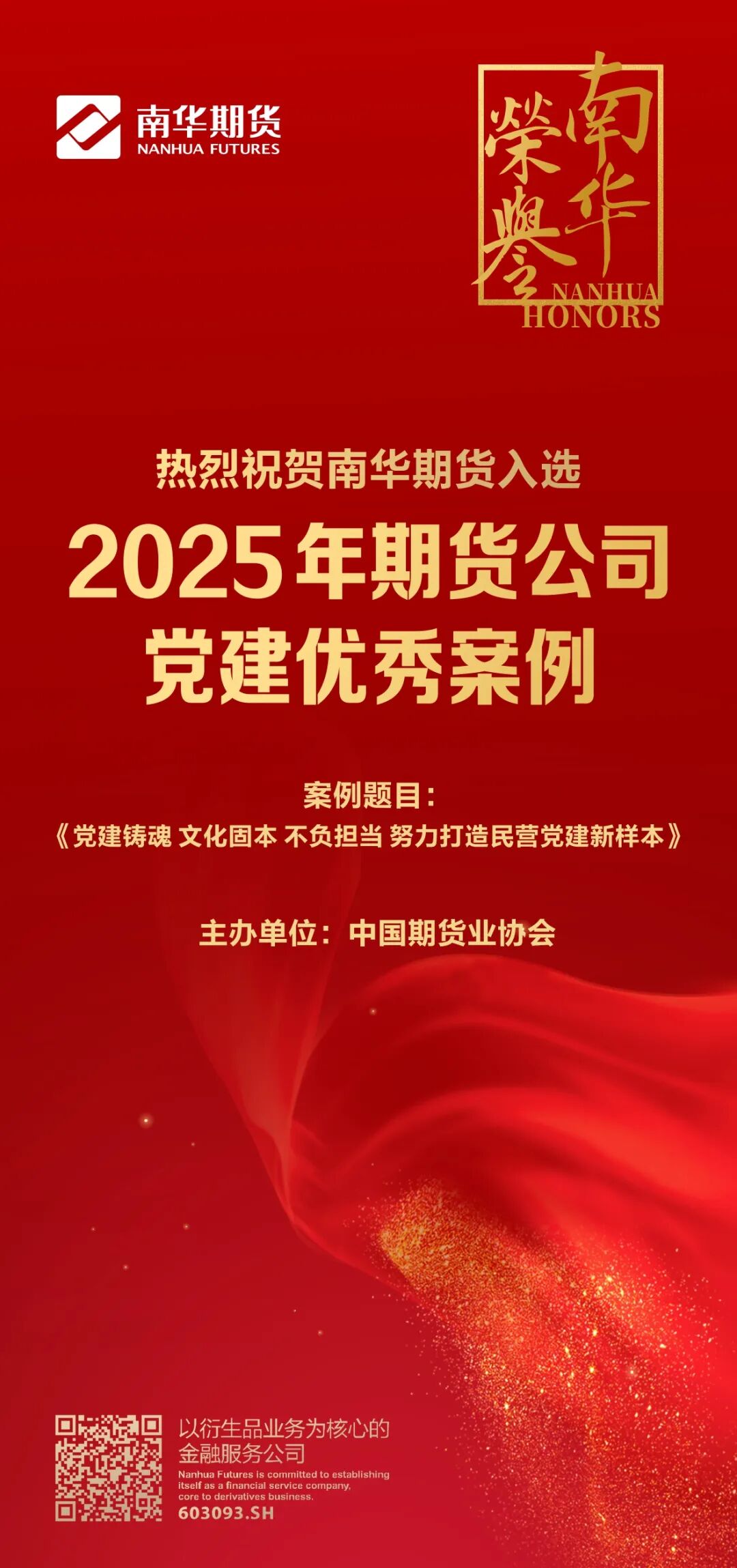 近日,中期协2025年期货公司党建优秀案例发布,南华期货选送案例《党建铸魂文化固本不负担当努力打造民营党建新样本》入选。