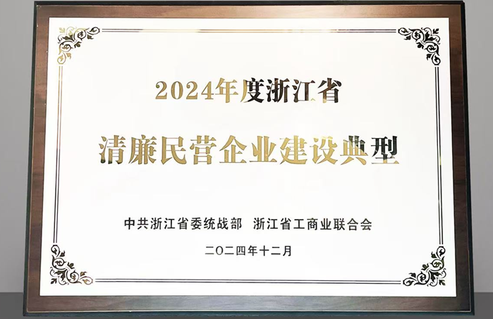 2024年公司先后荣获“清廉民企建设培育试点单位”“浙江省清廉民营企业建设典型”等荣誉称号。