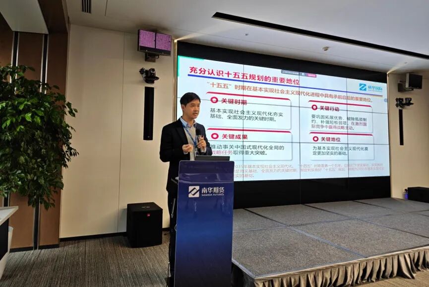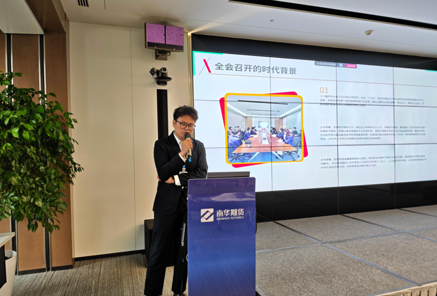 南华期货 党群办张正明主任带领大家重温《建议》,全面学习了其15个部分61条主要内容,并就“十五五”规划指导原则、发展目标和战略任务进行了重点解读。他表示,《建议》指出,要坚持把发展经济的着力点放在实体经济上。服务实体经济是期货市场发展的根本宗旨,也是 南华期货 一路发展、躬身践行的理念。 南华期货 作为国内最早开展“保险+期货”项目的期货公司之一,始终高度重视“保险+期货”在服务农业产业现代化、助力乡村振兴战略方面的应用实践。随着期货市场的高质量对外开放,也对期货公司“引进来”“走出去”提出了新的要求。 南华期货 经过多年的努力,逐步在全球范围内建立了覆盖亚洲、欧洲、北美的业务网络,形成了24小时不间断的全球金融服务体系,在服务“一带一路”国家倡议中走在行业前列。
