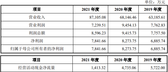 2019年至2021年,江苏华辰营业收入分别为63,185.61万元、68,146.46万元、87,105.08万元,净利润分别为6,885.74万元、8,273.75万元、7,841.66万元,归属于母公司所有者的净利润分别为6,885.74万元、8,273.75万元、7,841.66万元,归属于发行人股东扣除非经常性损益后的净利润分别为6,744.14万元、7,901.28万元、5,941.65万元,经营活动现金净流量分别为5,722.00万元、4,735.06万元、1,413.32万元。