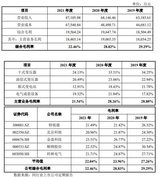 2019年至2021年,江苏华辰综合毛利率分别为29.29%、28.83%、22.46%,主营业务毛利率分别为28.80%、28.26%、21.54%,同行业可比上市公司毛利率均值分别为27.26%、23.96%、22.04%。
