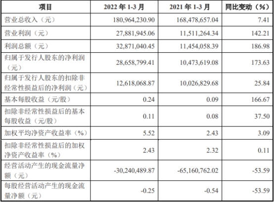 2022年1-3月,江苏华辰营业总收入为18,096.42万元,归属于发行人股东的净利润为2,865.88 万元,归属于发行人股东的扣除非经常性损益后的净利润为1,261.81万元,经营活动产生的现金流量净额为-3,024.05万元。