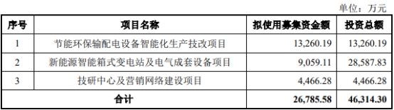 江苏华辰2022年4月27日披露的招股说明书显示,公司拟募集资金26,785.58万元,其中,13,260.19万元用于节能环保输配电设备智能化生产技改项目,9,059.11万元用于新能源智能箱式变电站及电气成套设备项目,4,466.28万元用于技研中心及营销网络建设项目。