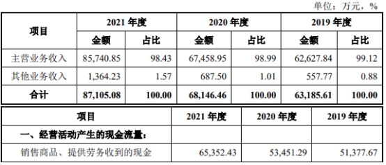 2019年至2021年,江苏华辰主营业务收入分别为62,627.84万元、67,458.95万元、85,740.85万元,销售商品、提供劳务收到的现金分别为51,377.67万元、53,451.29万元、65,352.43万元。