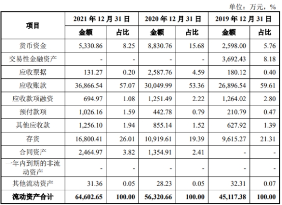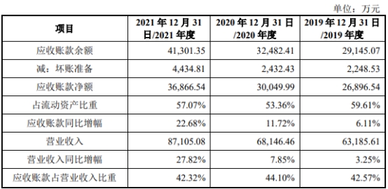 2019年至2021年,江苏华辰应收账款账面价值分别为26,896.54万元、30,049.99万元、36,866.54万元,占流动资产比例分别为59.61%、53.36%、57.07%,占营业收入的比重分别为42.57%、44.10%、42.32%。