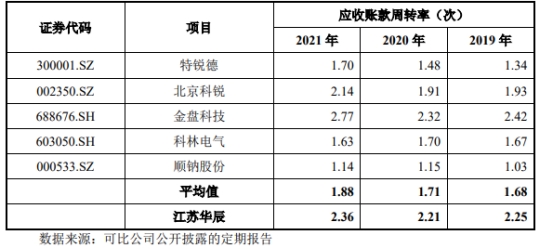 2019年至2021年,江苏华辰应收账款周转率分别为2.25次、2.21次、2.36次,同行业可比上市公司均值分别为1.68次、1.71次、1.88次。