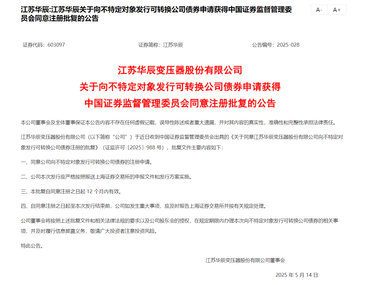 5月13日晚,江苏华辰向不特定对象发行可转换公司债券的注册收到中国证监会的批复。据悉,该募投项目完成后,该公司的箱式变电站产能将再次实现翻倍。