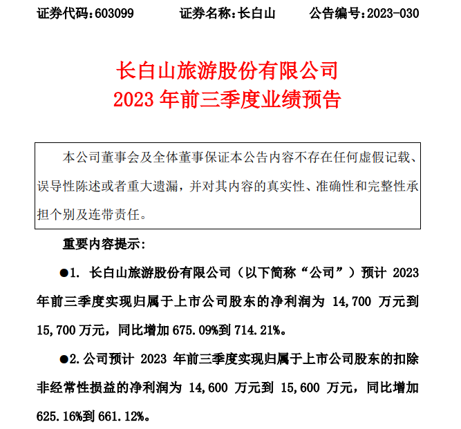 对此,长白山在业绩预告中表示,2023年前三季度,长白山景区接待游客数量与上年同期相比有较大幅度的增长,公司营收与上年同期相比增长约3.39亿元,在做好成本管控的基础上,实现了盈利能力的提升。
