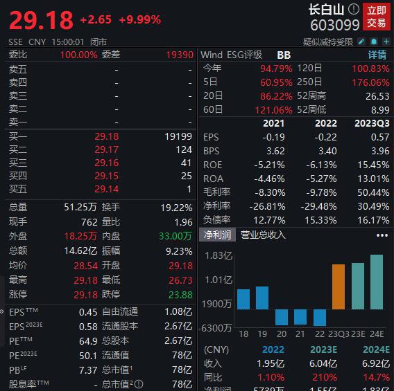 业绩方面,长白山2023年前三季度实现营收4.97亿元,同比增长209.37%;归属于上市公司股东的净利润1.52亿元,同比增长693.26%。