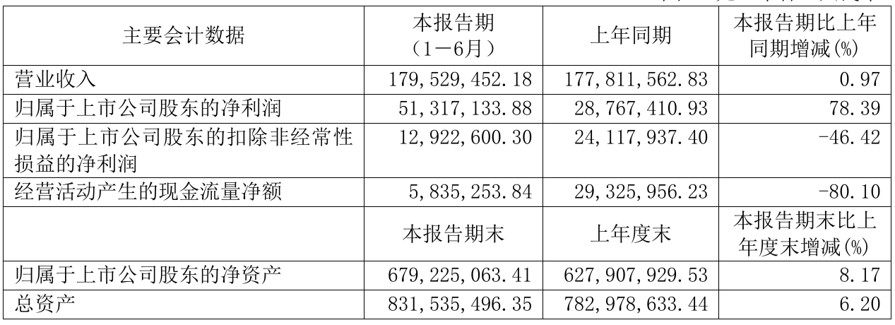 8月17日,东方材料(603110)近日发布2021年半年度报告,报告期内营业收入179,529,452.18元,同比增加0.97%;净利51,317,133.88元,同比净利增加78.39%。