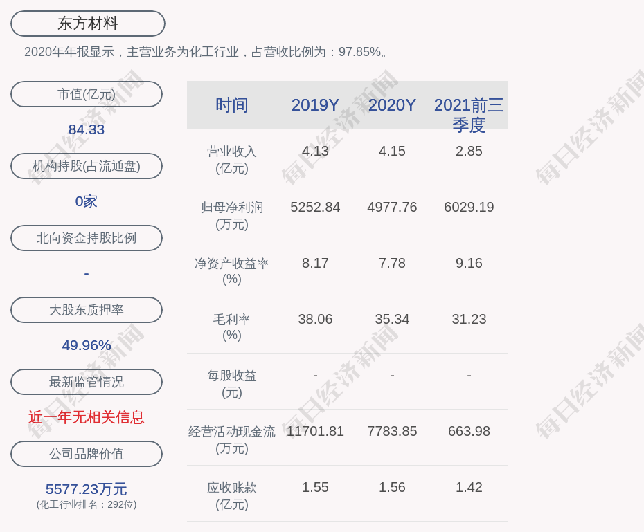 2020年年报显示,东方材料的主营业务为化工行业,占营收比例为:97.85%。