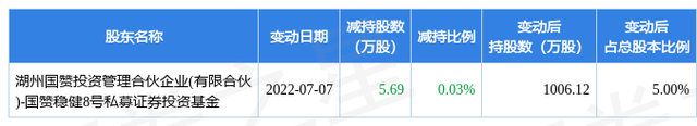 7月7日东方材料发布公告《603110:关于持股5%以上股东减持达1%暨减持后持股比例低于5%的提示性公告》,其股东湖州国赞投资管理合伙企业(有限合伙)-国赞稳健8号私募证券投资基金于2022年7月1日至2022年7月7日间合计减持5.69万股,占公司目前总股本的0.0283%,变动期间该股股价下跌1.44%,截止7月7日收盘报36.93元。
