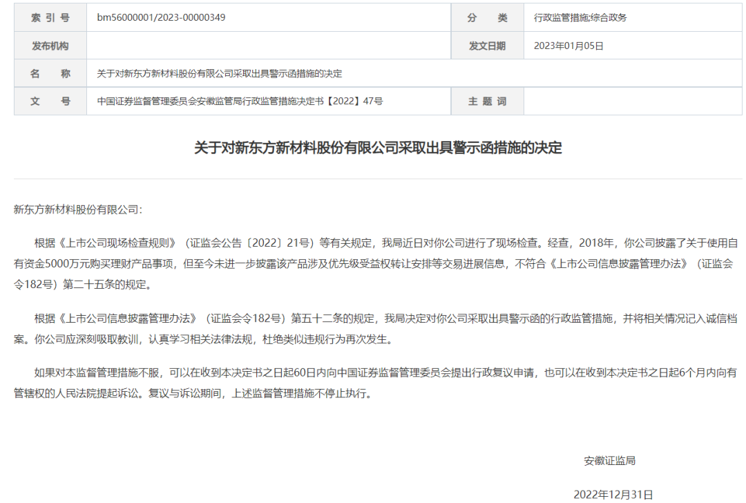 日前,安徽证监局发布的【2022】47号行政监管措施决定书,直指上市公司新东方新材料股份有限公司(简称:东方材料)的信披违规事项。