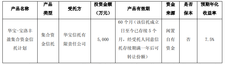 经第三届董事会第十一次会议和第三届监事会第九次会议审议通过,东方材料全资子公司新东方油墨有限公司(简称:新东方油墨)出资5,000万元认购华宝-宝洛丰盈集合资金信托计划(下称“华宝-宝洛丰盈”)。信托资金用于QDII产品及股权收益权投资(视情况而定)以间接参与普洛斯私有化项目。期限五年(已运作5个月),预期年化收益率为7.5%。