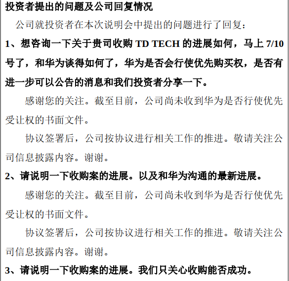 此后,东方材料在8月18日发布的半年报中表示,发行收购的相关工作及与相关方的沟通尚在进行中,尚未从诺基亚收到“TD TECH”公司少数股东是否行使优先受让权的回函。