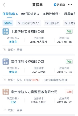 目前黄保忠除是ST万林在册股东之外,还担任了“靖江保利投资有限公司”的法定代表人、“上海沪瑞实业有限公司”的董事,此外还曾担任过已注销企业“泰州港航人力资源服务有限公司”的监事。其中“上海沪瑞实业有限公司”注册成立于2001年,在2021年一季度末还是ST万林持股6.74%的股东,后将所持股份转让给了ST万林现任董事长樊继波控制的共青城铂瑞投资合伙企业(有限合伙)。