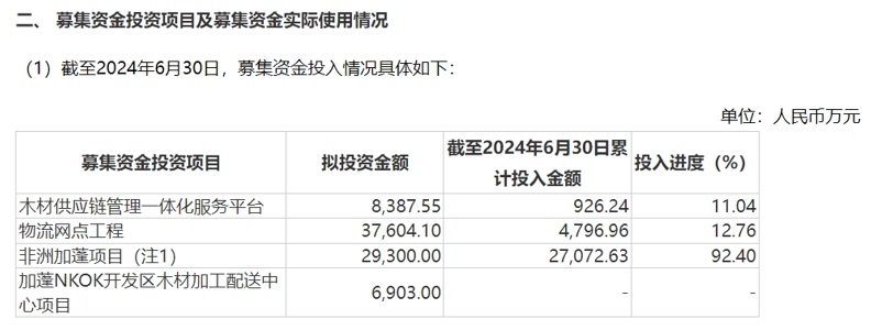 特别是原计划投资金额为8387.55万元的“木材供应链管理一体化服务平台”,截至2024年6月30日累计投入金额仅为926.24万元,投入进度为11.04%;原计划投资金额为3.76亿元的“物流网点工程”,截至2024年6月30日累计投入金额仅为4796.96万元,投入进度为12.76%,均与原先预计存在较大幅度偏离。