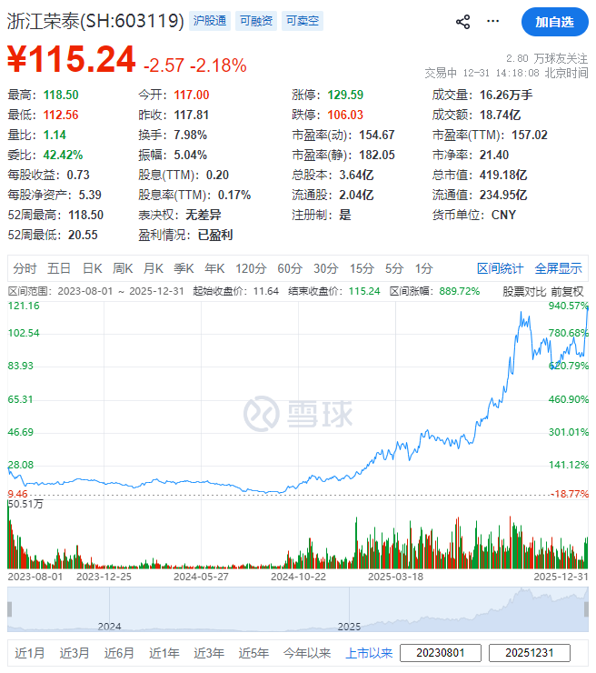 浙江荣泰(603119.SH)于2023年8月1日在上交所上市,截至周三(12月31日)发稿时间,其总市值约419.18亿元人民币。