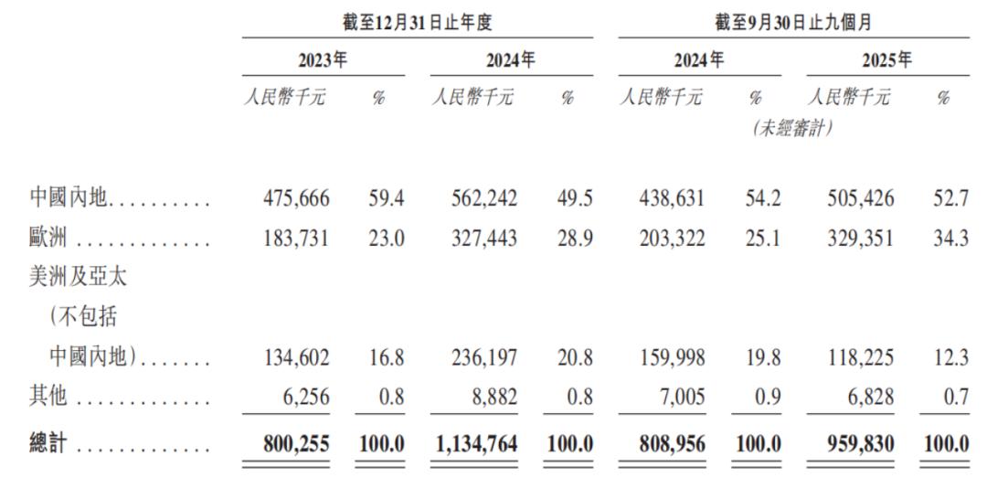 国内市场为浙江荣泰贡献超一半的收入,公司产品还销往欧洲、美洲、亚太及其他地区。其中,来自欧洲市场的收入增速迅猛,2024年及2025年前9个月,该增速达到78.22%、61.98%,超过公司总收入增速,同时,欧洲市场收入占比也由期初的23%增至期末的34.3%。
