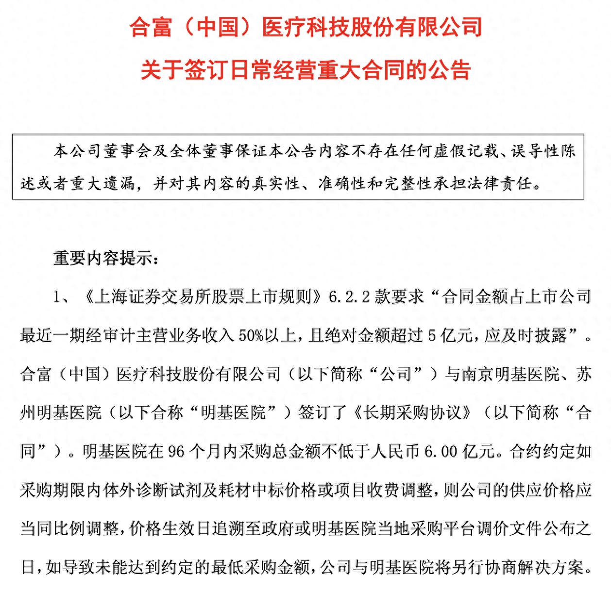 合富中国当日公告,公司与南京明基医院、苏州明基医院(合称“明基医院”)签订了《长期采购协议》。明基医院在96个月内采购总金额不低于6亿元。