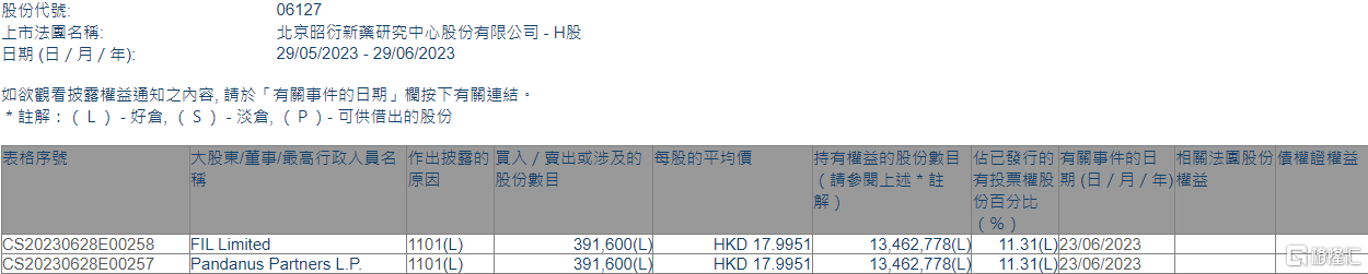 根据联交所最新权益披露资料显示,2023年6月23日,昭衍新药(06127.HK)获FIL Limited在场内以每股均价17.9951港元增持39.16万股,涉资约704.69万港元。