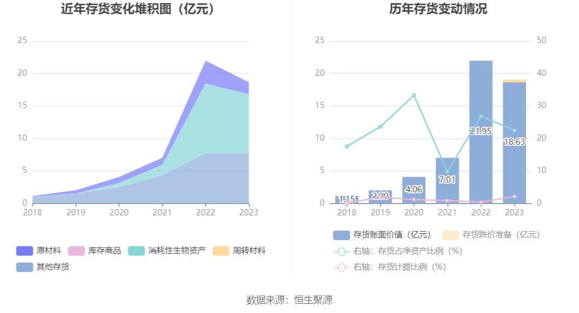从存货变动来看,截至2023年年末,公司存货账面价值为18.63亿元,占净资产的22.5%,较上年末减少3.32亿元。其中,存货跌价准备为4016.6万元,计提比例为2.11%。