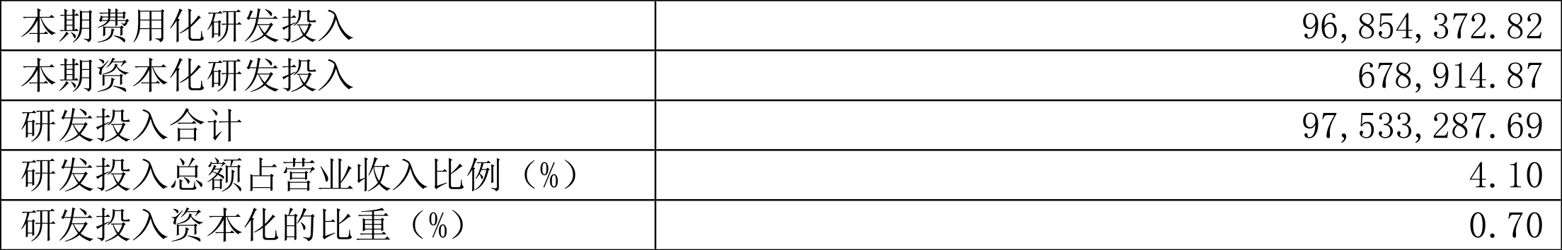2023年全年,公司研发投入金额为9753.33万元,同比增长25.07%;研发投入占营业收入比例为4.10%,相比上年同期上升0.66个百分点。此外,公司全年研发投入资本化率为0.70%。
