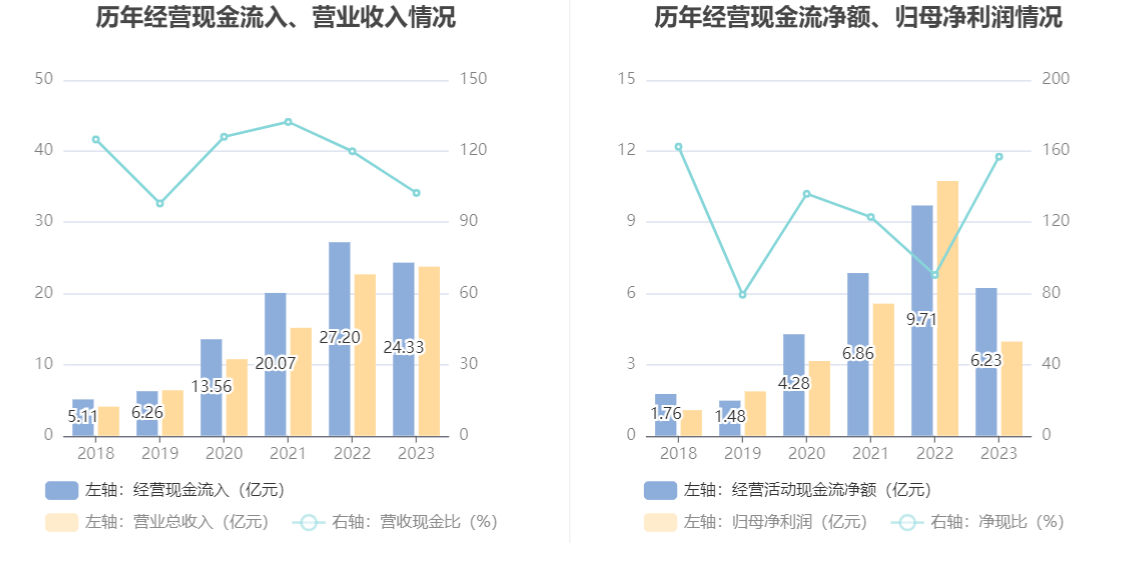 2023年,公司营业收入现金比为102.39%,净现比为156.90%。