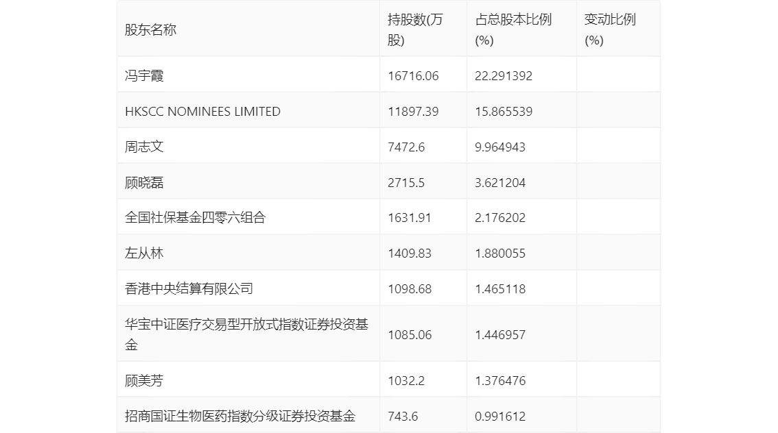 年报显示,2023年年末公司十大流通股东中,新进股东为招商国证生物医药指数分级证券投资基金,取代了三季度末的中欧医疗健康混合型证券投资基金。在具体持股比例上,HKSCC NOMINEES LIMITED、左从林、香港中央结算有限公司、华宝中证医疗交易型开放式指数证券投资基金持股有所下降。