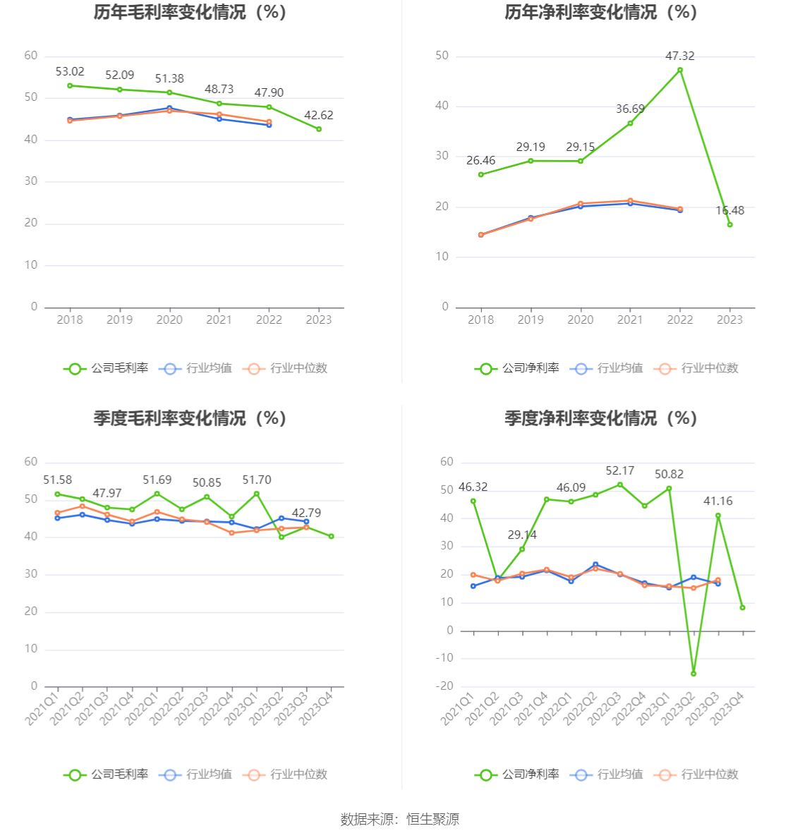 2023年,公司毛利率为42.62%,同比下降5.28个百分点;净利率为16.48%,较上年同期下降30.84个百分点。从单季度指标来看,2023年第四季度公司毛利率为40.30%,同比下降5.27个百分点,环比下降2.49个百分点;净利率为8.28%,较上年同期下降36.32个百分点,较上一季度下降32.88个百分点。