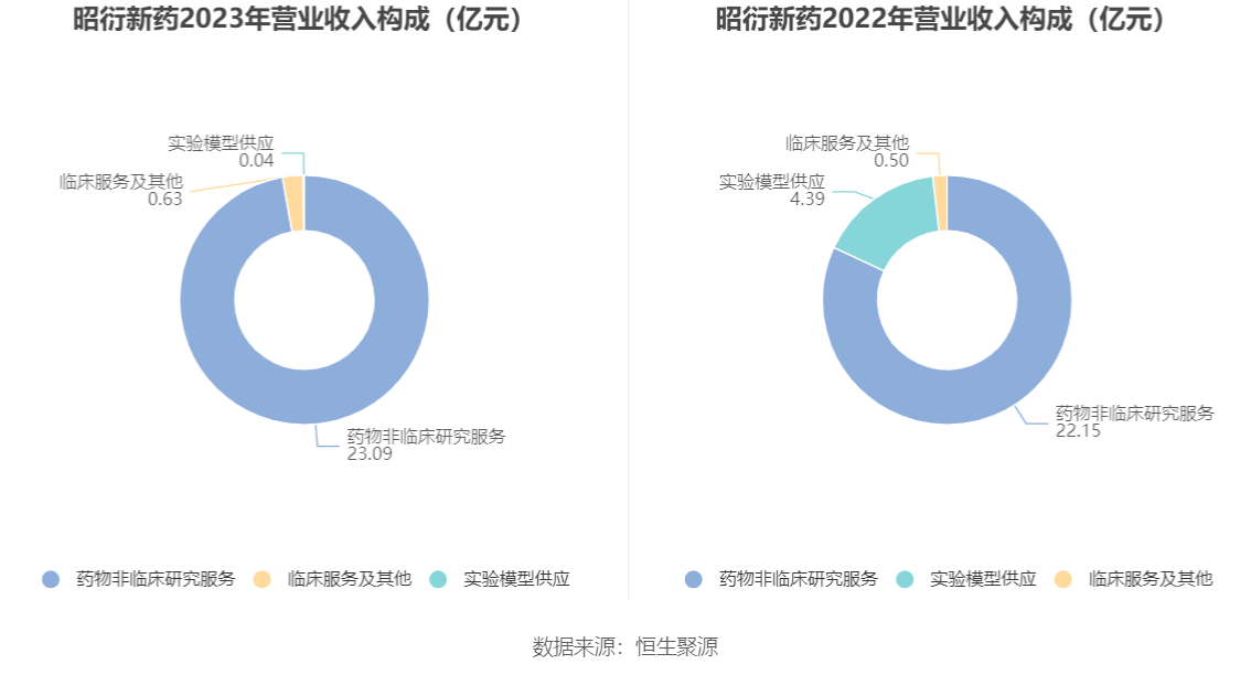 分产品来看,2023年公司主营业务中,药物非临床研究服务收入23.09亿元,占营业收入的97.16%;临床服务及其他收入6342.32万元,占营业收入的2.67%;实验模型供应收入406.44万元,占营业收入的0.17%。