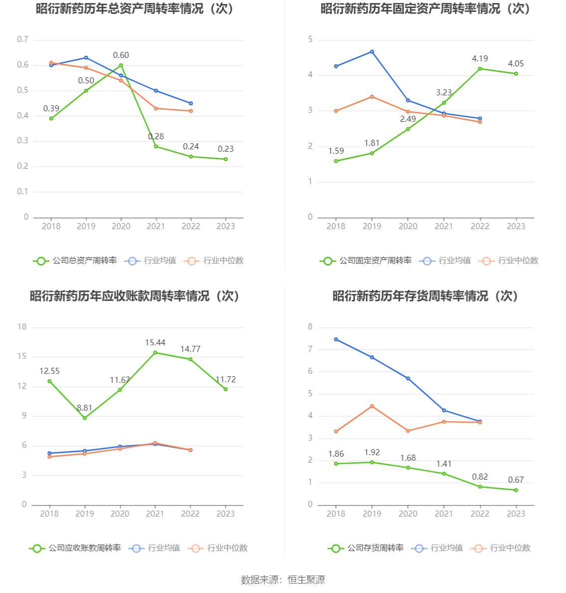 营运能力方面,2023年,公司公司总资产周转率为0.23次,上年同期为0.24次(2022年行业平均值为0.45次,公司位居同行业24/28);固定资产周转率为4.05次,上年同期为4.19次(2022年行业平均值为2.79次,公司位居同行业7/28);公司应收账款周转率、存货周转率分别为11.72次、0.67次。