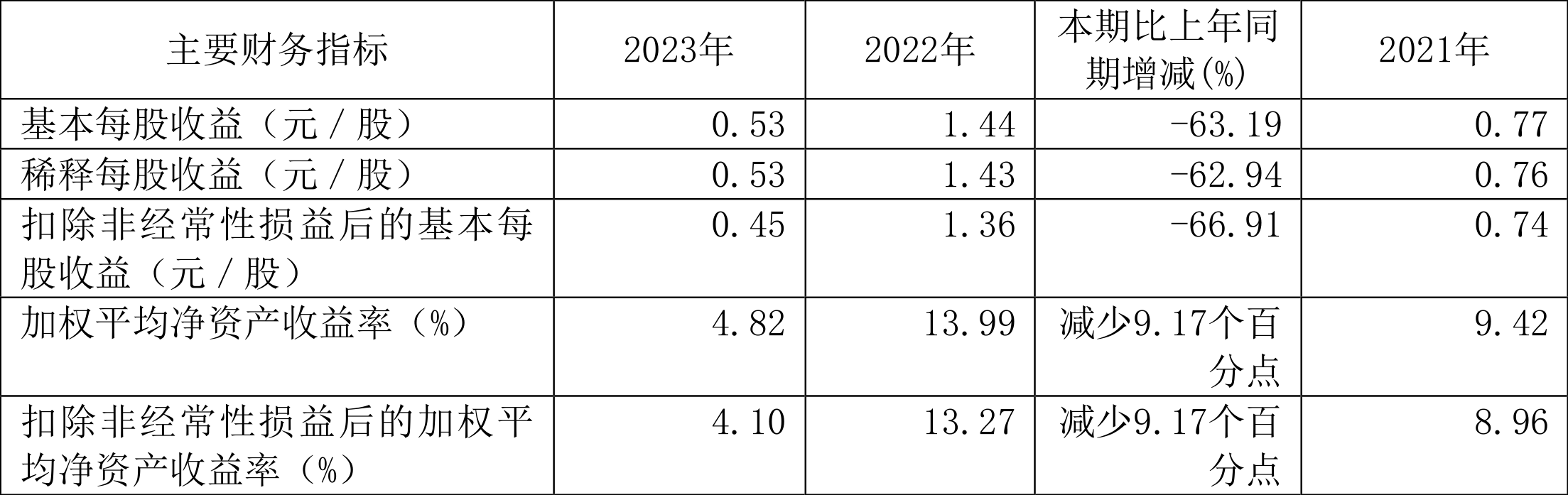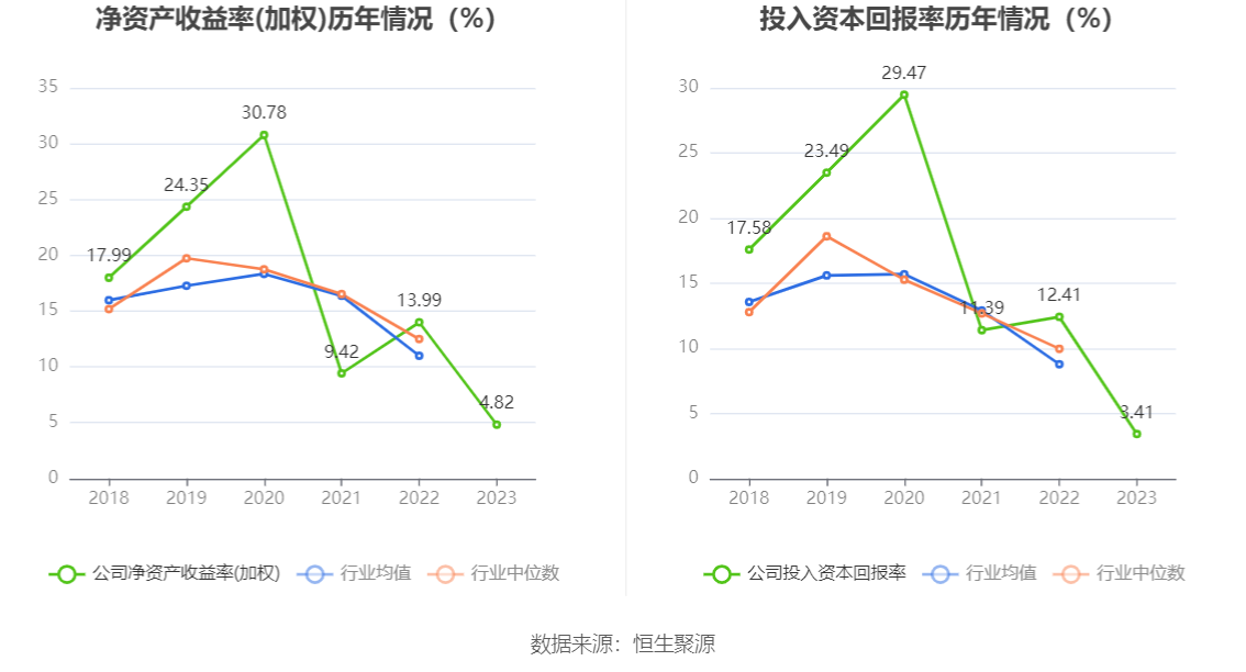 数据显示,2023年公司加权平均净资产收益率为4.82%,较上年同期下降9.17个百分点;公司2023年投入资本回报率为3.41%,较上年同期下降9.00个百分点。