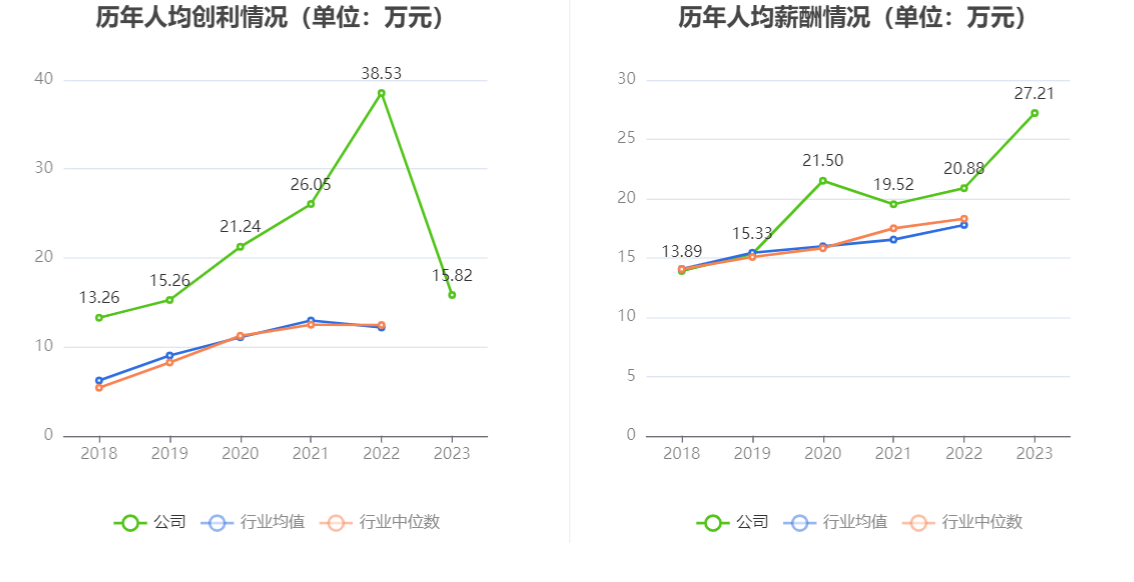 截至2023年末,公司员工总数为2510人,人均创收94.68万元,人均创利15.82万元,人均薪酬27.21万元,较上年同期分别变化16.39%、-58.95%、30.35%。