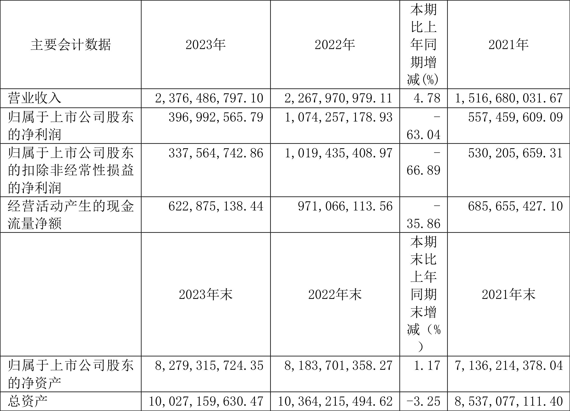 2023年,公司经营活动现金流净额为6.23亿元,同比下降35.86%;筹资活动现金流净额-3.62亿元,同比减少2.62亿元;投资活动现金流净额-3.15亿元,上年同期为-21.6亿元。