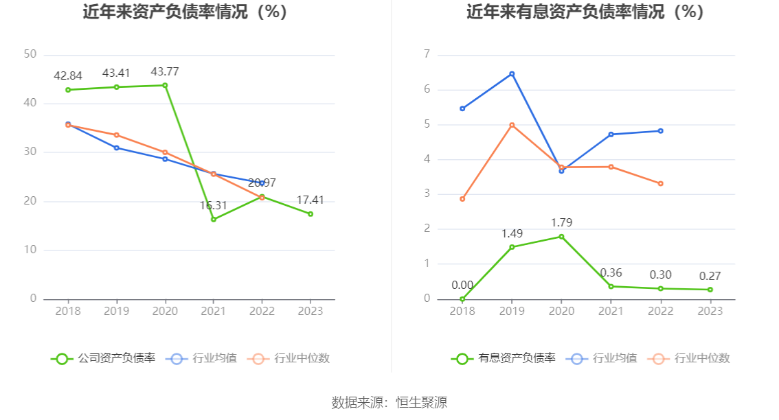 在偿债能力方面,公司2023年年末资产负债率为17.41%,相比上年末下降3.56个百分点;有息资产负债率为0.27%,相比上年末下降0.03个百分点。