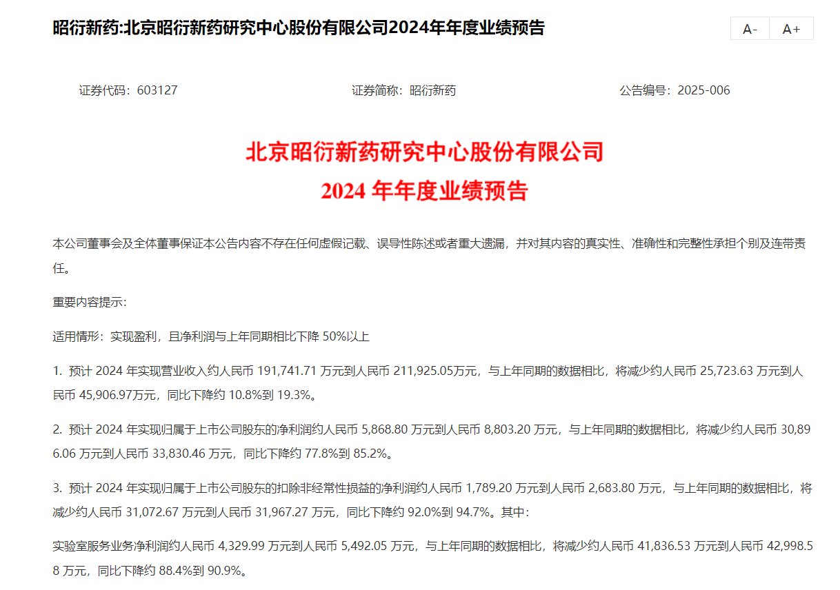 昭衍新药发布的2024年业绩预告显示,预计2024年实现营业收入19.17亿元至21.19亿元,同比下降10.8%-19.3%;归母净利润5868.8万元至8803.2万元,同比下降77.8%-85.2%;扣非净利润预计1789.2万元2683.8万元,同比下降92%-94.7%。