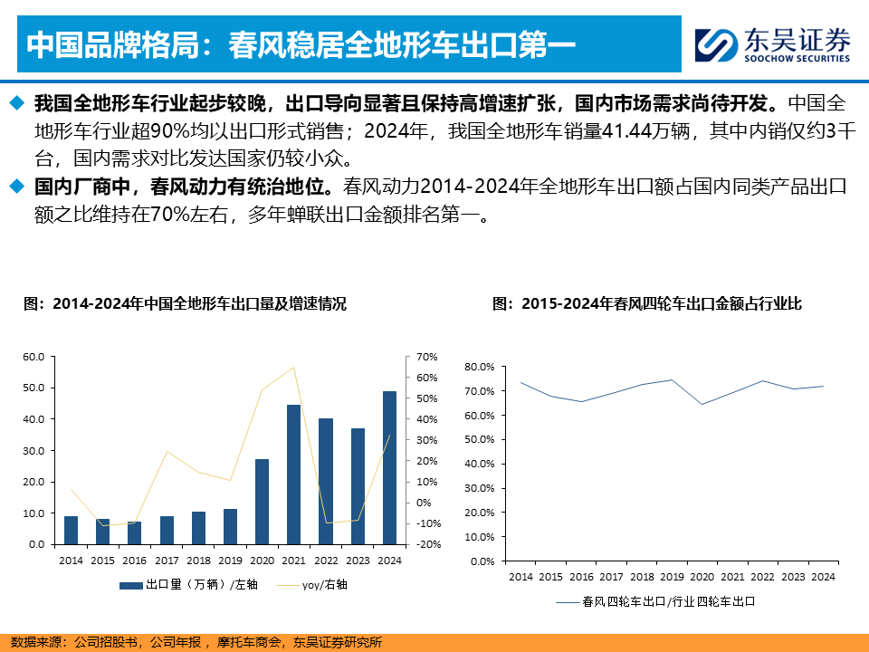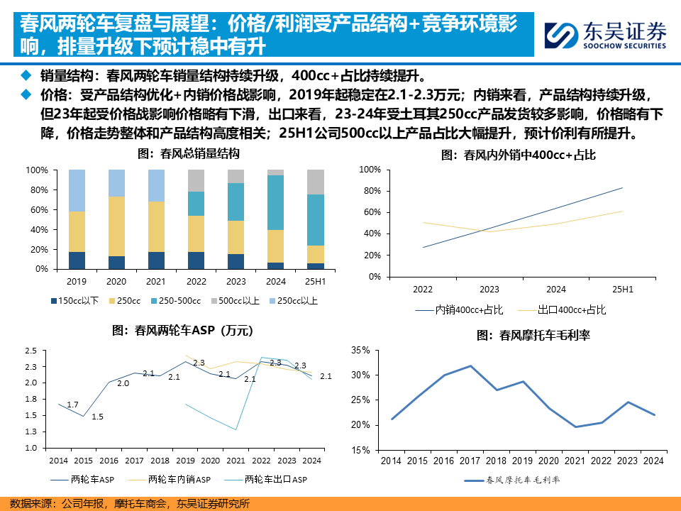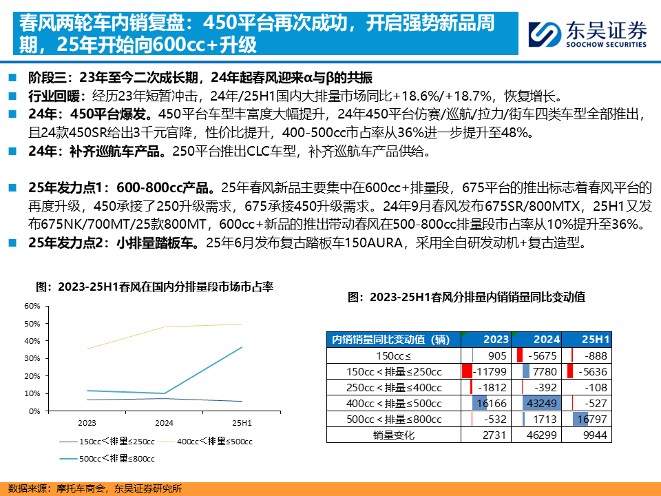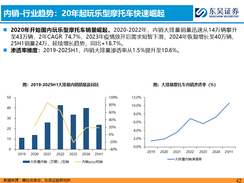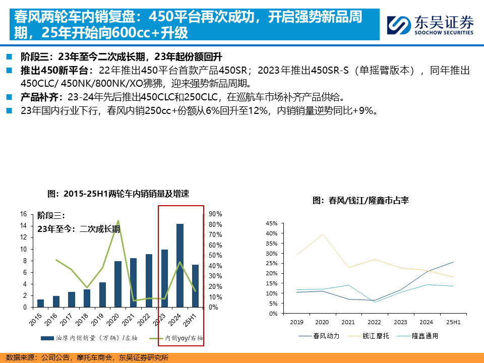 2020年起国内玩乐型摩托车市场崛起,2020-2024年销量由14万辆增长至40万辆,且随着国内玩家的水平进阶,排量在持续上移,当前国内大排量渗透率依旧处于较低水平,对标海外仍有翻倍空间。20年春风于空白市场推出爆品250SR,全年销量达4.6万辆,拉动春风20年内销同比+84%;继20年的爆发之后,250cc市场竞争加剧+新品周期弱势导致春风内销21-22年持续处于增长降速、市占率下滑状态;23年起,春风450平台开始发力,开启强势产品周期,24-25年,675/750新平台推出,且700/800平台新品频出,产品周期持续强劲。