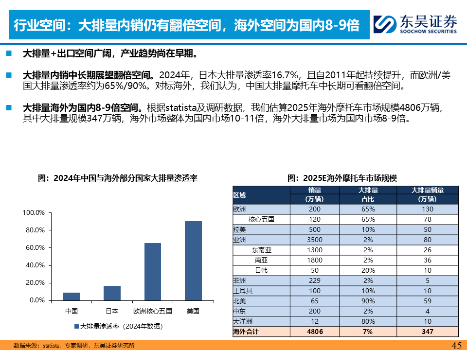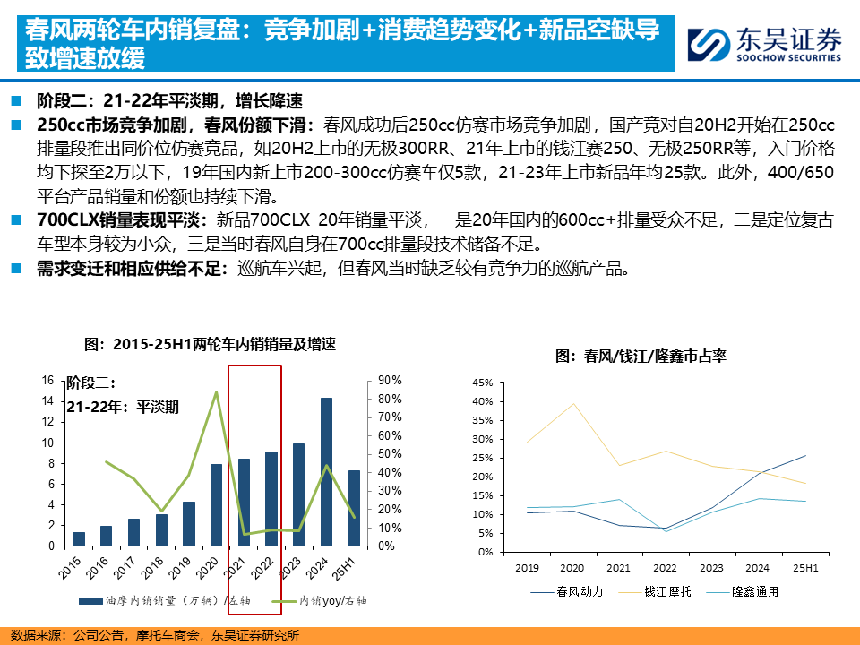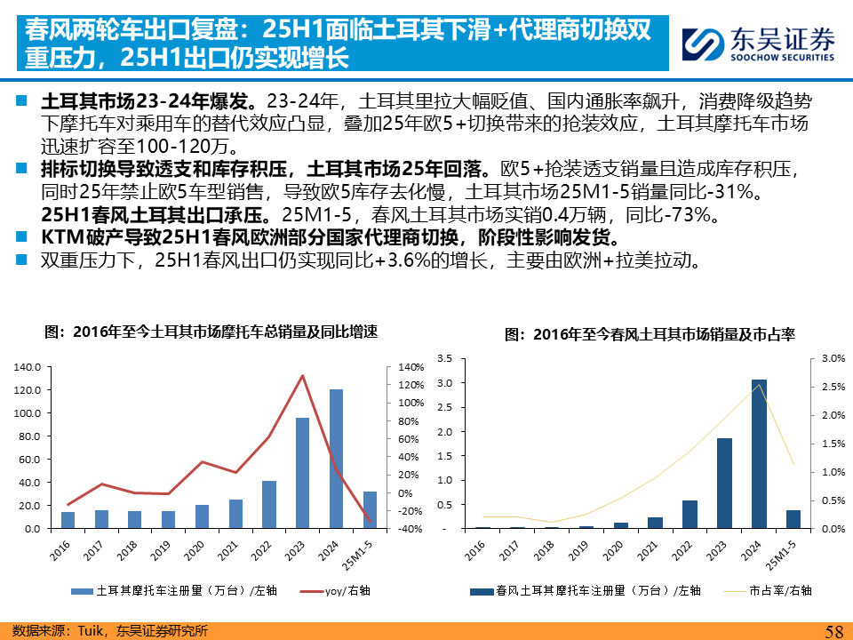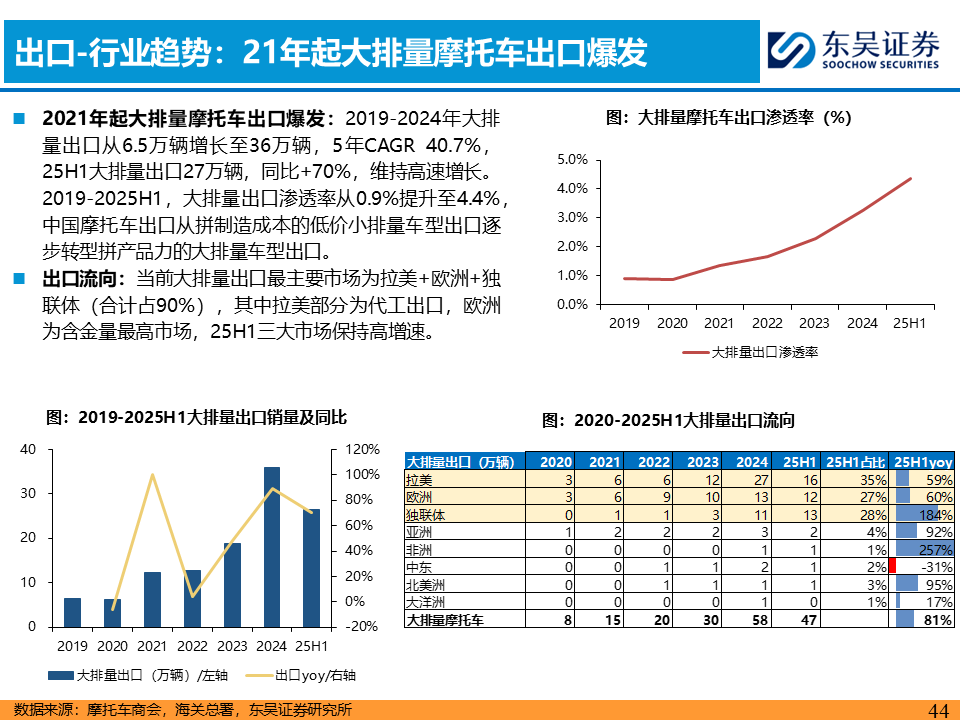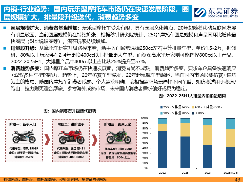 2020年起国内玩乐型摩托车市场崛起,2020-2024年销量由14万辆增长至40万辆,且随着国内玩家的水平进阶,排量在持续上移,当前国内大排量渗透率依旧处于较低水平,对标海外仍有翻倍空间。20年春风于空白市场推出爆品250SR,全年销量达4.6万辆,拉动春风20年内销同比+84%;继20年的爆发之后,250cc市场竞争加剧+新品周期弱势导致春风内销21-22年持续处于增长降速、市占率下滑状态;23年起,春风450平台开始发力,开启强势产品周期,24-25年,675/750新平台推出,且700/800平台新品频出,产品周期持续强劲。