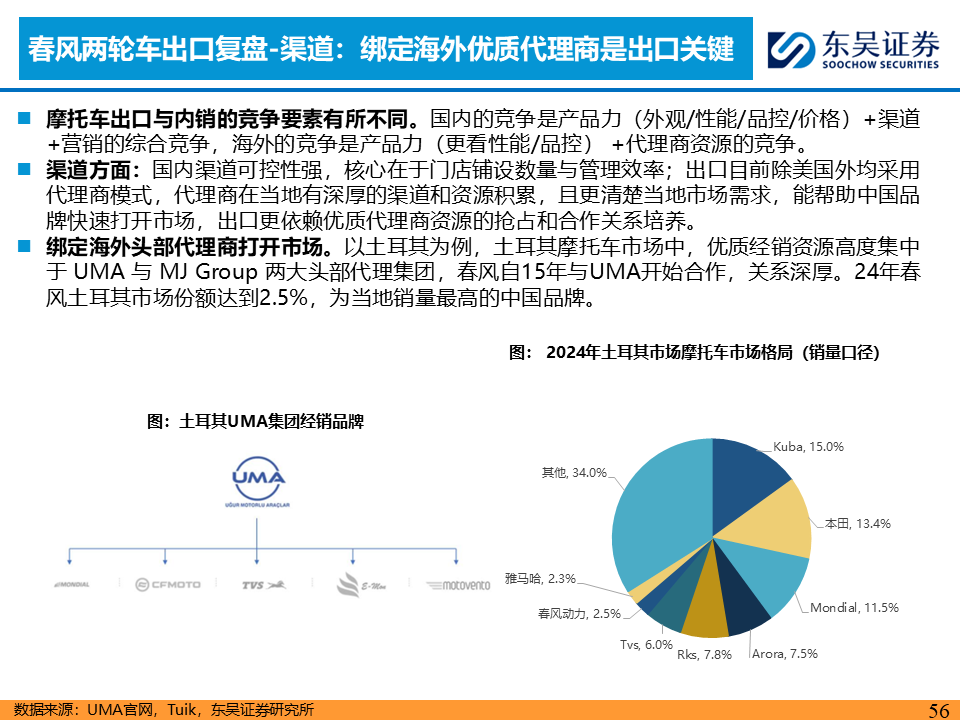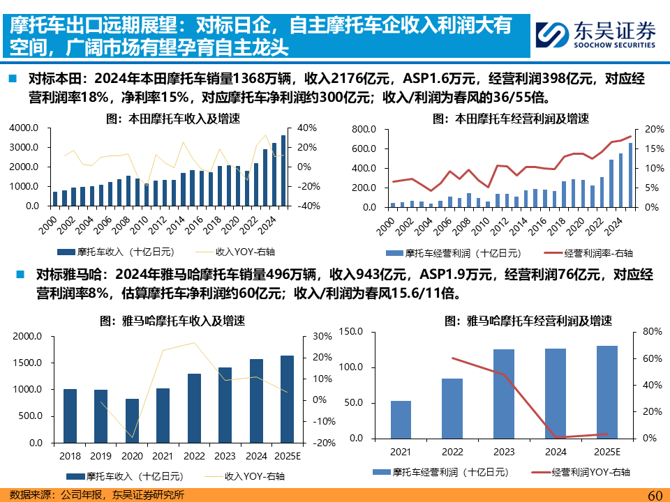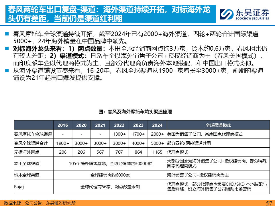 海外摩托车市场空间4000-5000万辆,其中大排量约350万辆,大排量+高端小排量近500万辆,市场空间广阔。2021年春风出口爆发,2020-2024年从1.2万辆增长至29.4万辆,4年CAGR 124%,成为当前摩托车最主要增长点,当前春风海外摩托车铺设渠道2000+家,在核心市场绑定优质经销商,凭借产品力+渠道资源逐步打开市场。对标海外龙头,春风仍在出口早期,2024年本田/雅马哈摩托车收入分别2176/943亿元,为春风的36/15.6倍,春风摩托车出口仍大有空间。