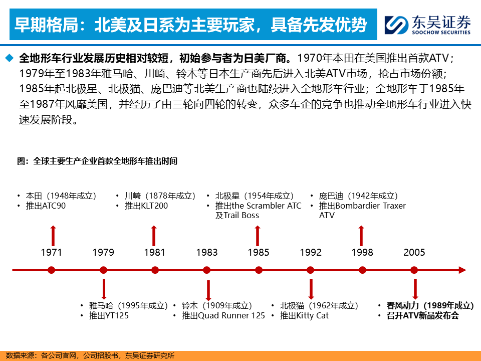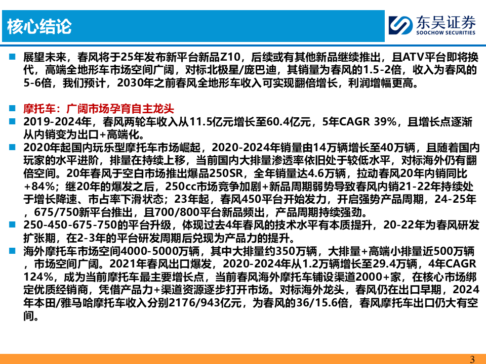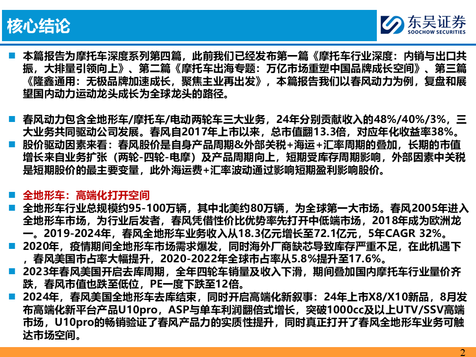 本篇报告为摩托车深度系列第四篇,此前我们已经发布第一篇《摩托车行业深度:内销与出口共振,大排量引领向上》、第二篇《摩托车出海专题:万亿市场重塑中国品牌成长空间》、第三篇《隆鑫通用:无极品牌加速成长,聚焦主业再出发》,本篇报告我们以春风动力为例,复盘和展望国内动力运动龙头成长为全球龙头的路径。