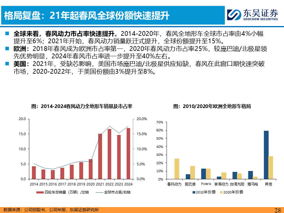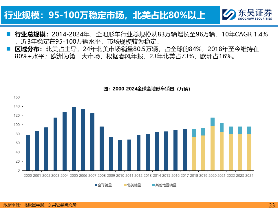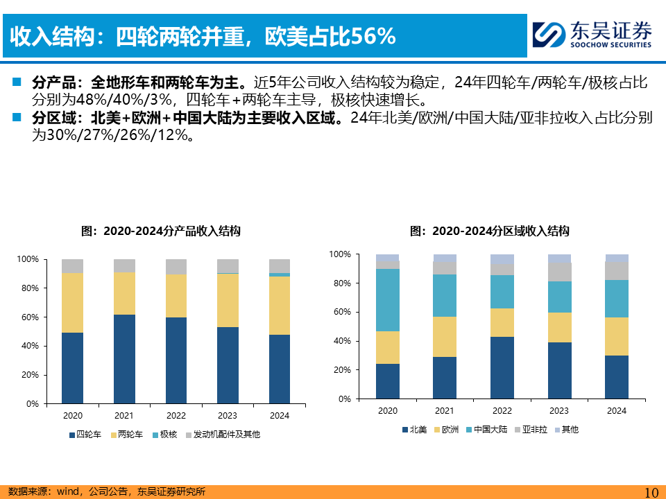 全地形车行业总规模约95-100万辆,其中北美约80万辆,为全球第一大市场。春风2005年进入全地形车市场,为行业后发者,春风凭借性价比优势率先打开中低端市场,2018年成为欧洲龙一。2019-2024年,春风全地形车业务收入从18.3亿元增长至72.1亿元,5年CAGR 32%。