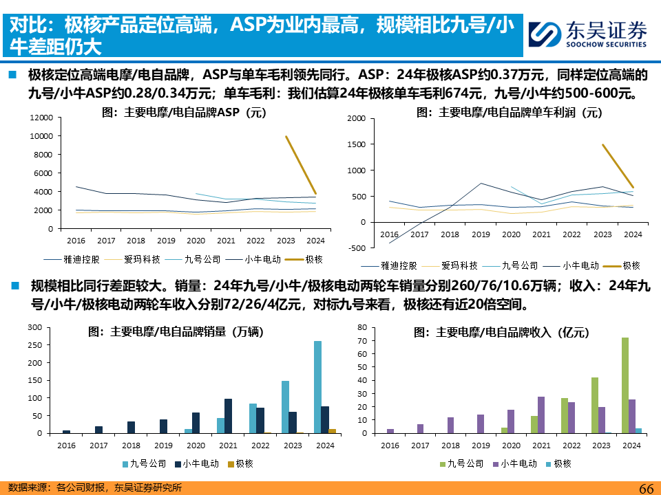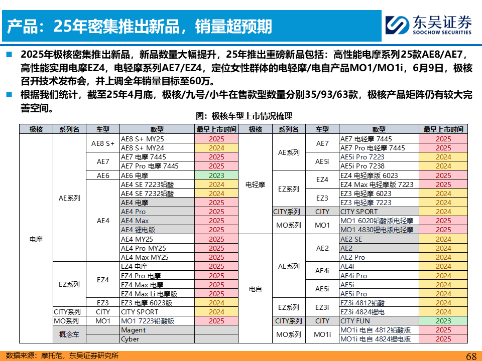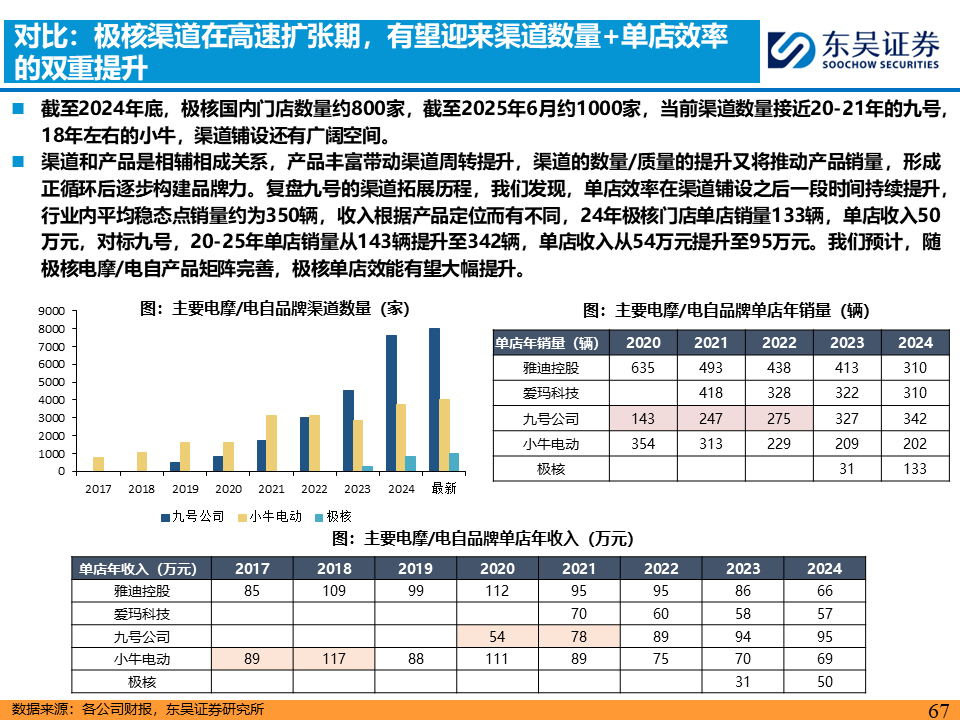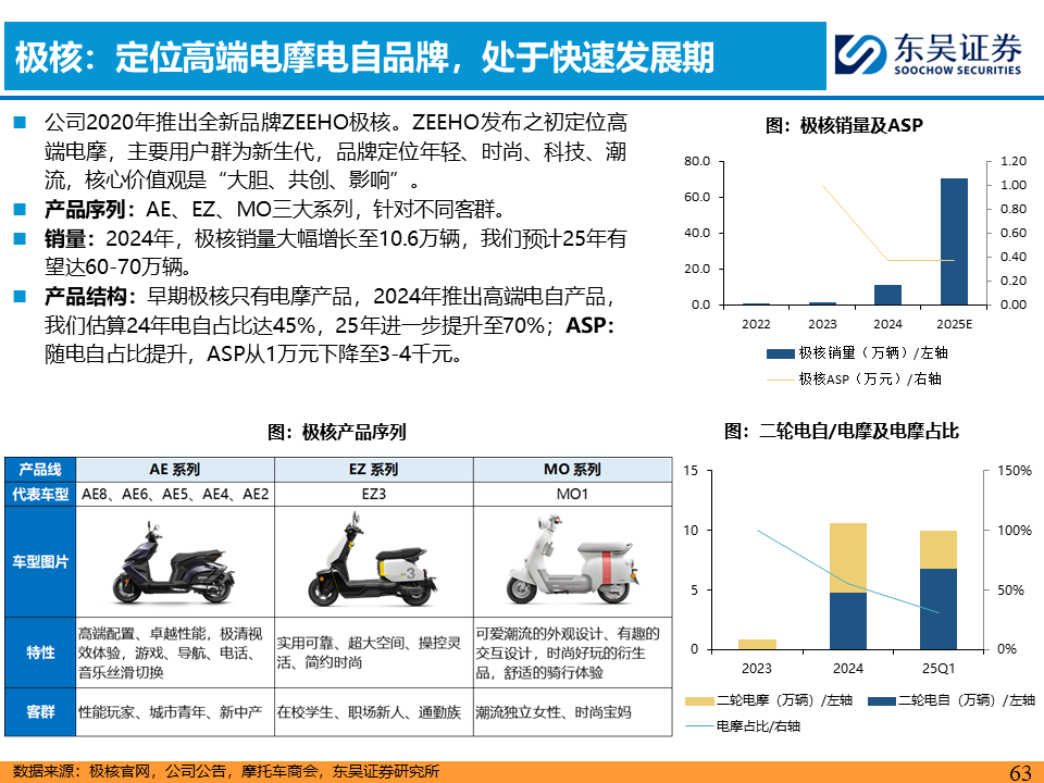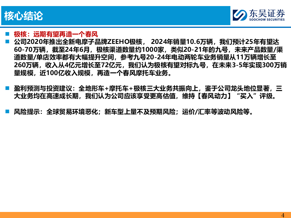 公司2020年推出全新电摩子品牌ZEEHO极核, 2024年销量10.6万辆,我们预计25年有望达60-70万辆,截至24年6月,极核渠道数量约1000家,类似20-21年的九号,未来产品数量/渠道数量/单店效率都有大幅提升空间,参考九号20-24年电动两轮车业务销量从11万辆增长至260万辆,收入从4亿元增长至72亿元,我们认为极核有望对标九号,在未来3-5年实现300万销量规模,近100亿收入规模,再造一个春风摩托车业务。